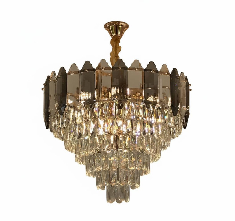 متاسفانه این کالا در حال حاضر موجود نیست. میتوانید از طریق لیست بالای صفحه، از محصولات مشابه این کالا دیدن نمایید.این لوستر کریستالی با طراحی مخروطی و کریستالهای چندلایه منشوری و اشکی، گزینهای عالی برای فضاهای لوکس و شیک است. انعکاس نور از کریستالها جلوهای چشمگیر و پرزرقوبرق به فضا میدهد و ترکیب آن با قاب طلایی براق، محیطی گرم و مجلل میسازد.
