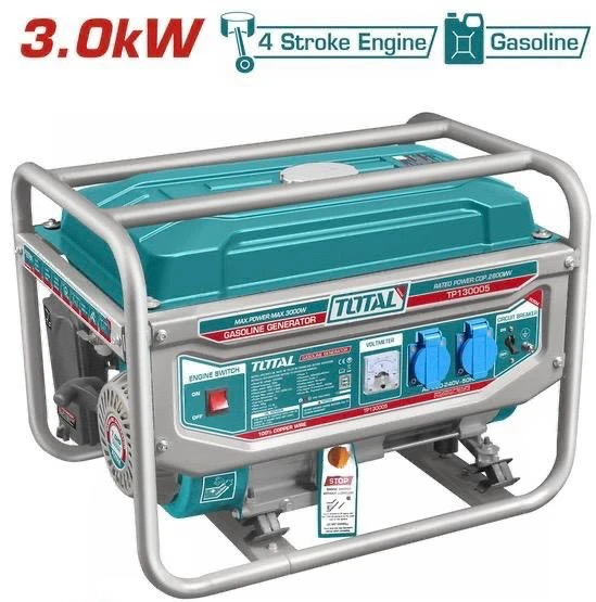موتور برق توتال TP130005-1، موتور برق 3000 وات با 2 عدد پورت خروجی 230 ولت AC با آمپر 13 ولت می باشد. موتور برق TP130005-1 توتال، موتور برق بنزینی 3000 وات برای راه اندازی لوازم برقی منزل، مانند: یخچال، لباسشویی، کولر، تلویزیون، پمپ آب خانگی مناسب می باشد