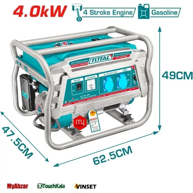 برند : TOTAL TP14000DR سوخت مصرف: بنزین ابعاد: 480*470*628 MM وزن 42 کیلوگرم تولید شده در فاصله 7 متری قدرت خروجی 4000 وات نوع ولتاژ خروجی AC , DC ولتاژ خروجی AC 220-230 ولت شدت جریان خروجی AC 17.6 آمپر شدت جریان خروجی DC 8 آمپر تعداد فاز تک فاز تعداد خروجی ها 2 عدد نوع موتور تک سیلندر حجم موتور 210 سی سی قدرت موتور 7 اسب بخار سایر توضیحات موتور 4 زمانه نوع سیستم خنک کننده هوا نوع استارت استارتی ظرفیت مخزن سوخت 15 لیتر ظرفیت مخزن روغن 0.6 لیتر ++++++++++++++++++++++++++++++++++ مزیت موتور برق های AVR(تنظیم کننده خودکار ولتاژ) ✅خروجی برق ثابت و یکسان ✅باعث صرفه جویی در مصرف سوخت ✅باعث افزایش کارایی و طول عمر موتور برق ✅تنظیم اتوماتیک ولتاژ به حداقل رساندن نوسانات ✅این سیستم می تواند برای دستگاههایی که به نوسانات برق خیلی حساس نیستند، مانند ابزارهای برقی صنعتی یا لوازم خانگی معمولی و همچنین دستگاه های پر قدرت مانند کمپرسورها، چکشهای برقی و لوازم خانگی که به نوسانات کمتر حساس هستند، گزینه خوبی محسوب می شوند. و از مزیت های خوب AVR فشار بر اجزای داخلی موتور برق را کاهش میدهد و به این ترتیب عمر آن را افزایش میدهد.