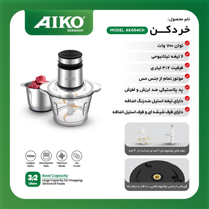خرد کن آیکو 654 با توان 700 وات و ظرفیت 3.2 لیتر و موتور تماما مسی و جنس تیغه 6 عدد تیغه تیتانیوم و قابلیت های دارای تیغه استیل ضد زنگ اضافه، دارای ظرف شیشه ای و ظرف استیل اضافه است