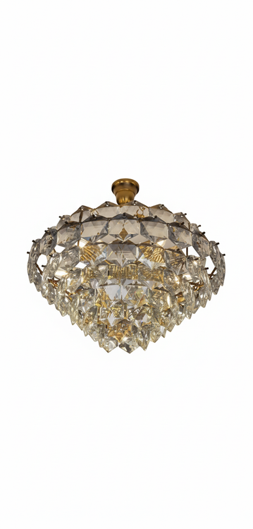 لوستر کریستالی منشوری با کریستالهای تراشخورده هندسی و قاب طلایی، انتخابی فوقالعاده برای افرادی است که به دنبال ترکیب جذابیت مدرن و شکوه کلاسیک هستند. طراحی لایهای این لوستر، هنگام روشن شدن نور را به شکلی چشمگیر در محیط پخش میکند و فضایی پرزرقوبرق و دلنشین ایجاد مینماید.