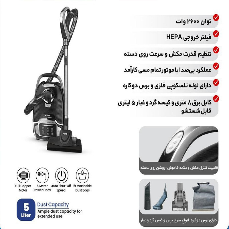 جارو برقی با قدرت: 2600 وات جنس موتور: تمام مس پر قدرت سوپر سایلنت(کم صدا) دارای فیلتر ضد حساسیت هپا داری سیستم فیلتر تسویه هوا دارای طراحی بسیار شیک دارای لوله خرطومی کنفی دارای سیم 8 متریدارای کیسه قابل شستشو 5 لیتری دارای سیستم حفاظتی خاموش شدن خودکار قدرت مکش قابل تنظیم دارای نمایشگر پر شدن کیسه دستگاه دارای دوشاخه برق مخصوص پریز های استاندارد ایران و اروپا دارای پاروی فلزی دارای سیم جمع کن اتوماتیک دارد