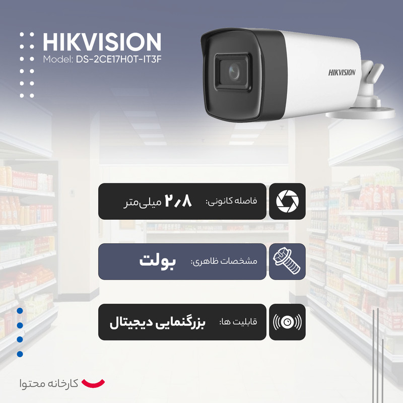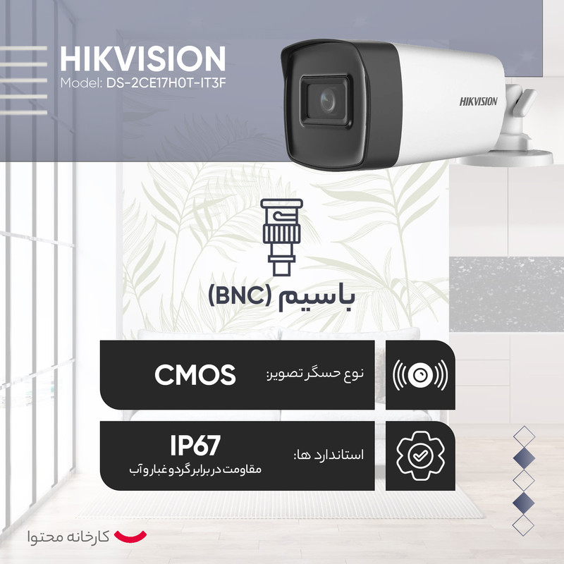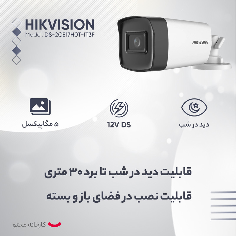 دوربین مداربسته هایک ویژن مدل DS-2CE17H0T-IT3F از نمونه دوربین های هایک ویژن است که به اسم بالت معروف و دارای لنز 2.8 و 3.6 میباشد و جنس این دوربین از فلز است و محصول جدید 2021 این شرکت میباشد و تفاوت این مدل دوربین های 5 مگاپیکسل هایک ویژن در این است که دارای ظاهری جدید و با کیفیت است و برای محیط های داخلی و خارجی قابل استفاده میباشد و از طراحی زیبایی بر خوردار و از نوع 5 مگاپیکسل میباشد و با دستگاه های هایک ویژن همخوانی دارد مثل 7204,7208,7216HQHI-M1 و 7204,7208,7216HUHI-M1 و این دوربین با قابلیت دید در شب 30 متر مربع است و با کمترین نور به حالت رنگی در میاید با حساسیت LUX 0.01 میباشد و در این سری از دوربین ها مصرف برق کمتری دارند و دارای DNR و D-WDR و دارای IP67 میباشد
