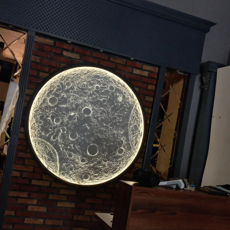 تابلو ماه برجسته مدل نوری کد ۱ جنس ام دی اف درجه یک مواد برجسته کاری از جنس تکسچر رنگ ماه سفید رنگ ام دی اف مشکی رنگ نور نچرال(رنگ بین نور سفید و زرد) قابل استفاده در منزل. تالار. رستوران. کافی شاپ و .....