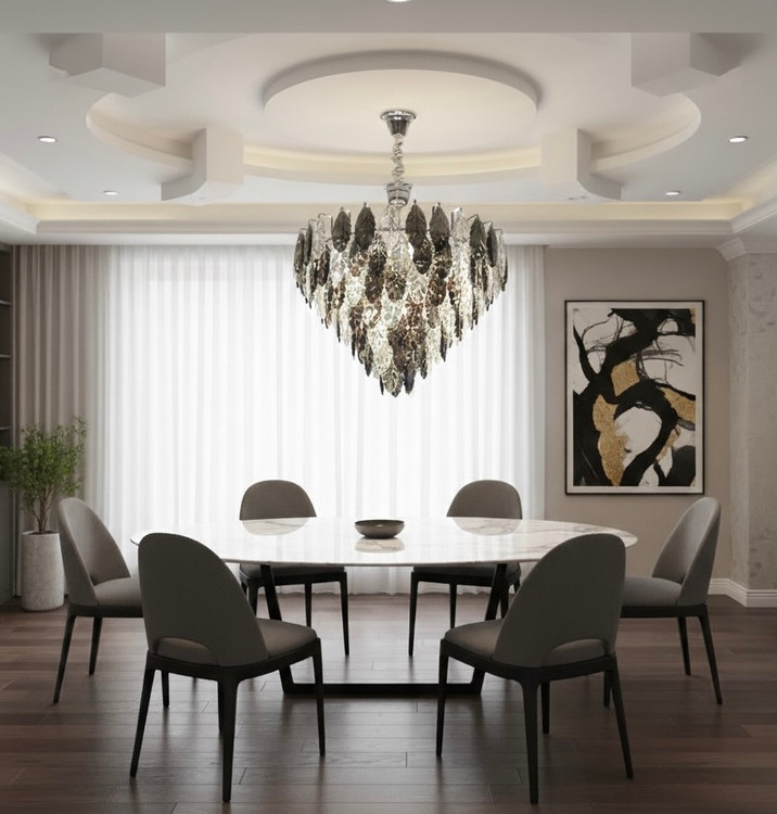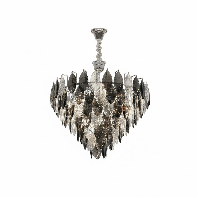این لوستر کریستالی مدرن با طراحی منحصر به فرد برگمانند، جلوهای لوکس و چشمگیر به فضای شما میبخشد. کریستالهای آن به صورت چندلایه و آبشاری آویزان شدهاند که علاوه بر انعکاس زیبا و درخشش نور، حس شکوه و جذابیت خاصی به دکوراسیون داخلی میدهد.
